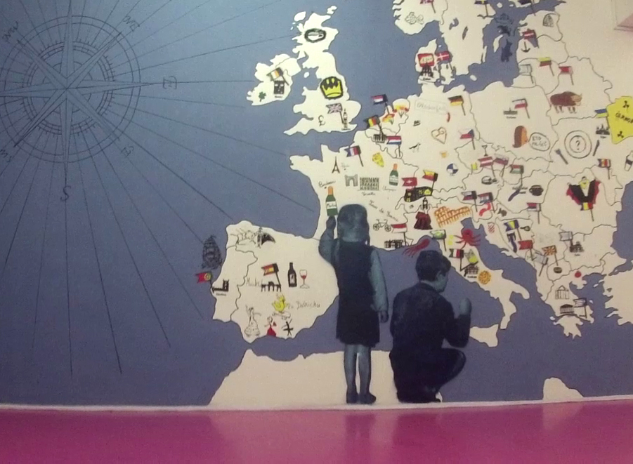 Odpoledne byla Evropa naplněná tak akorát. Když poslední děti odešly, vydrhli jsme podlahu od barvy a nanesli popředí dvou dětí, které si na stěnu soustředěně malují. Chlapec a dívka z našeho atelieru vyšli na 6 vrstev ručně vyřezaných šablon o velikosti 140x100cm.
